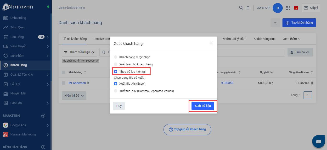 - Chọn Theo bộ lọc hiện tại và chọn Xuất dữ liệu