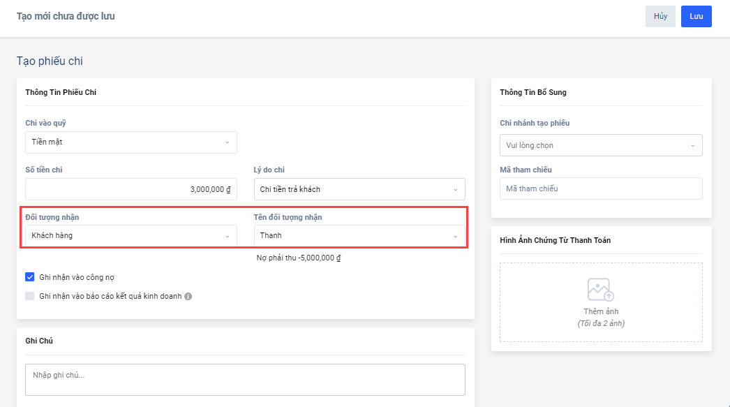 Nhà bán cũng có thể thực hiện tạo phiếu thu chi để ghi nhận công nợ cho khách hàng