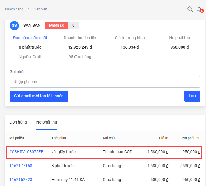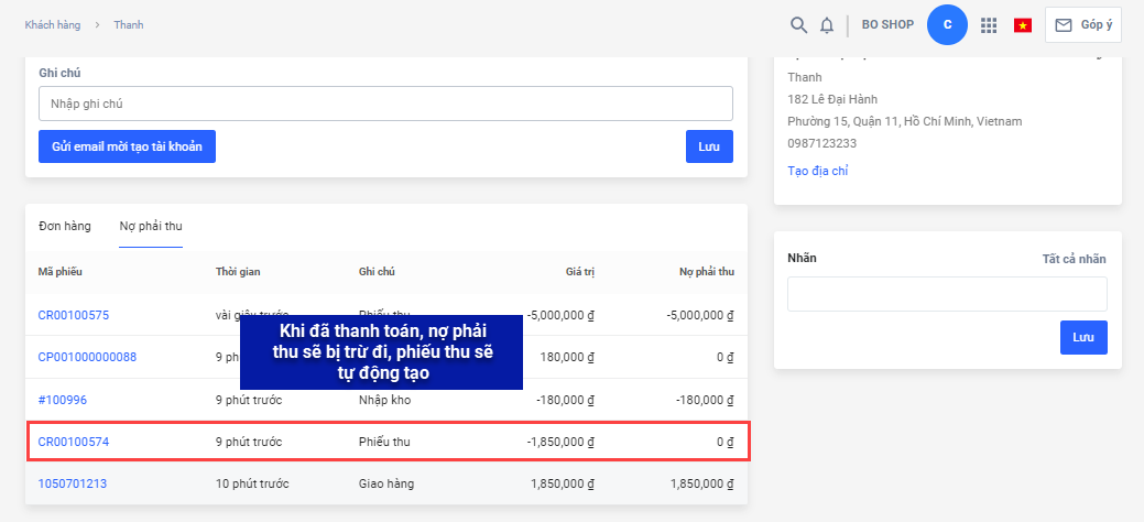 - Khi trạng thái thanh toán được chuyển sang Đã thanh toán, khoản nợ phải thu sẽ bị trừ đi và được ghi chú Thanh toán COD trong công nợ khách hàng, nhưng phiếu thu sẽ không được tạo ra