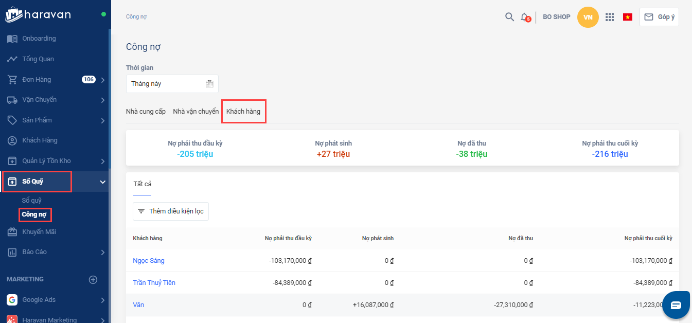 Để xem công nợ khách hàng, bạn chọn mục Sổ quỹ trên trang quản trị MyHaravan -> chọn Công nợ và chọn mục Khách hàng