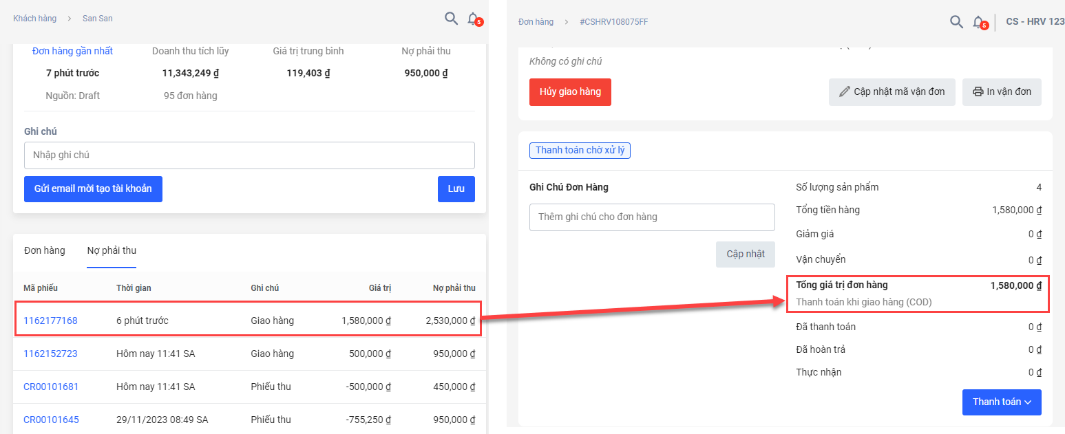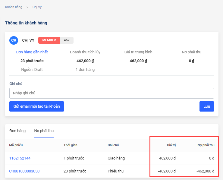 - Khi đơn có trạng thái thanh toán là Đã thanh toán, hệ thống tựtạo phiếu thu ghi nhận giá trị đơn hàng. Nợ phải thu sẽghi nhận nợ phải thu là số âm, nghĩa là bạn đã nhận tiền của khách và ghi chú là Phiếu thu
