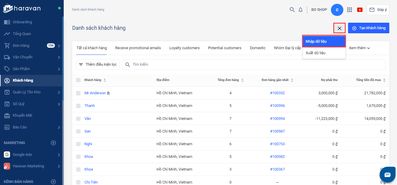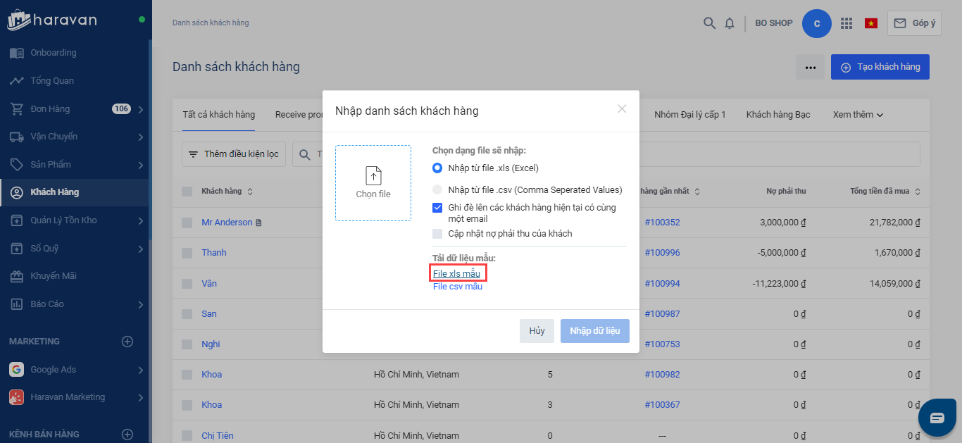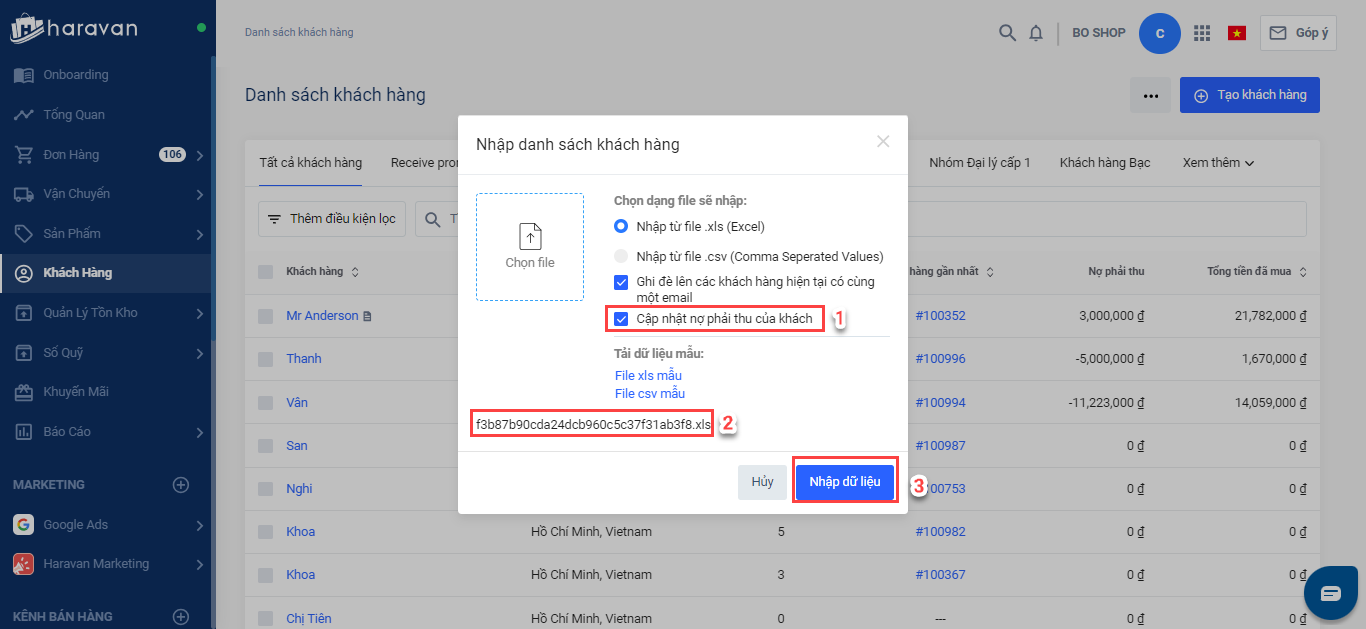 Nhà bán có thể thực hiện nhập file để ghi nhận hoặc điều hoặc điều chỉnh công nợ cho hàng loạt khách hàng. Tính năng này sẽ hỗ trợ nhà bán hàng dễ dàng tổng hợp và quản lý các khoản cần thu của khách hàng ngay trên trang quản trị MyHaravan