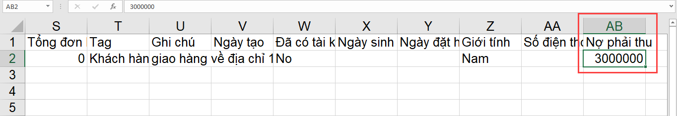 Ví dụ khách hàng đang nợ nhà bán 3.000.000, nhà bán nhập file ghi nợ phải thu là 5.000.000.