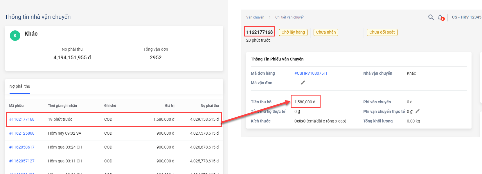 Với đơn COD, giá trị đơn hàng sẽ được ghi nhận công nợ nhà vận chuyển, nghĩa là bạn cần thu tiền COD từ nhà vận chuyển. Để trừ công nợ nhà vận chuyển, bạn cần thực hiện thao tác nhập file đối soát và xác nhận thanh toán.