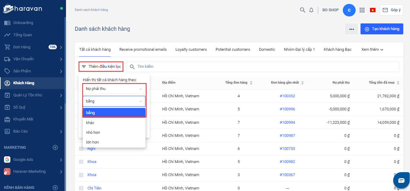 - Tại mục Khách hàng , bạn chọn Thêm bộ lọc -> chọn Nợ phải thu và chọn các điều kiện là Bằng, Khác, Lớn hơn hoặc Nhỏ hơn