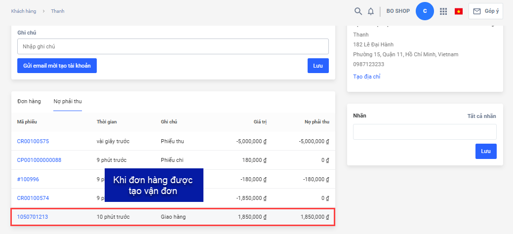 2. Khi thực hiện tạo vận đơn cho đơn hàng, công nợ sẽ cộng lại giá trị đơn để công nợ được cân bằng về 0, ghi chú là Giao hàng