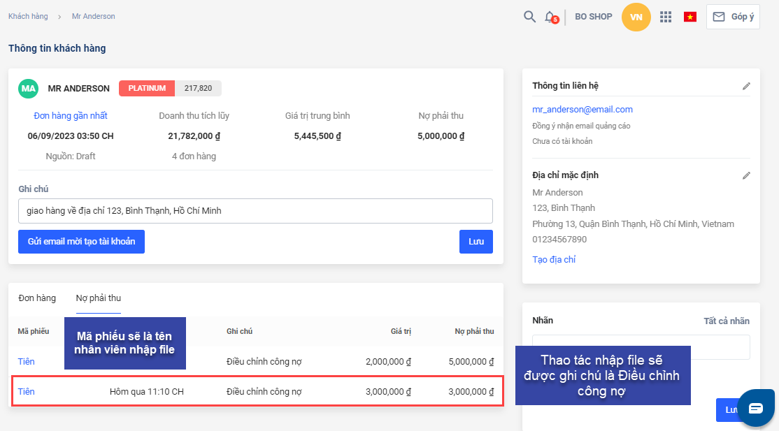 Khi nhập file thành công, nợ phải thu hiện tại của khách hàng này sẽ là 5.000.000.