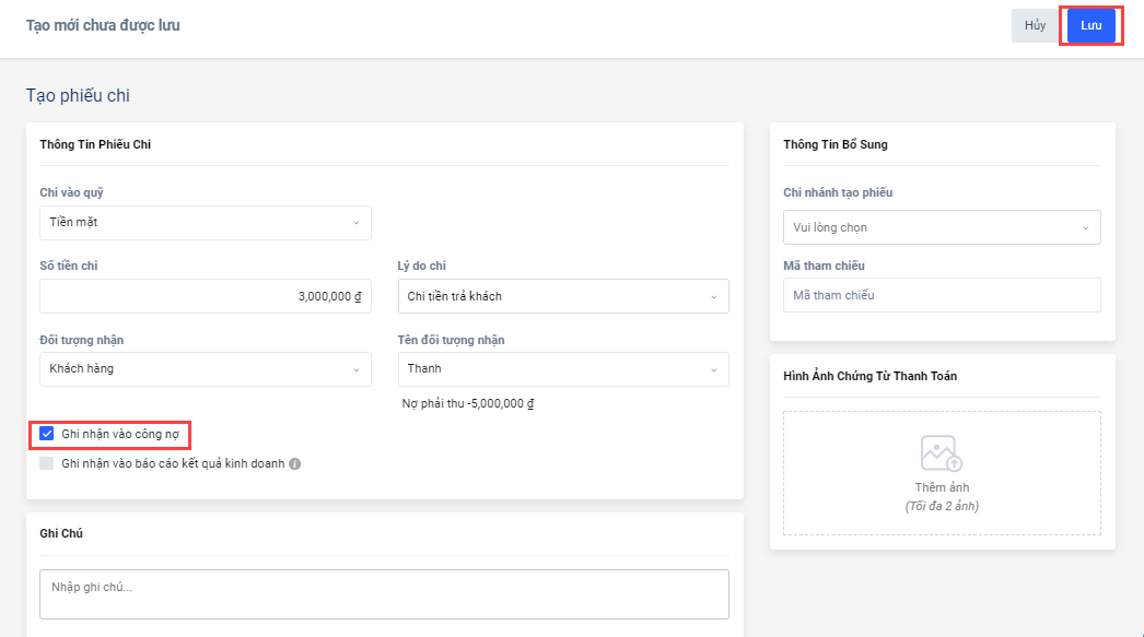 - Chọn Ghi nhận vào công nợ để giá trị trên phiếu thu / chi được ghi nhận vào công nợ của khách hàng