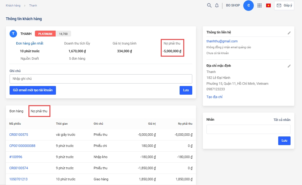 Trang chi tiết khách hàng bổ sung thông tin nợ phải thu và tab nợ phải thu sẽ ghi nhận các giao dịch có tác động đến công nợ của khách hàng