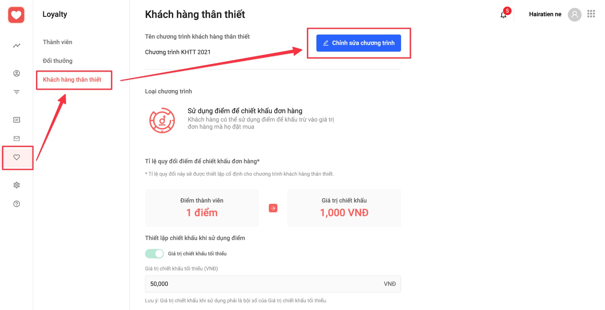1.3 Sau khi đã tải xong danh sách các nhóm khách hàng thân thiết, bạn thực hiện tạm dừng chương trình KHTT của Haravan Loyalty. Tại App HaraLoyalty cũ, chọn Menu Chương trình Loyalty (trái tim)-> chọn Khách hàng thân thiết -> chọn Chỉnh sửa chương trình.