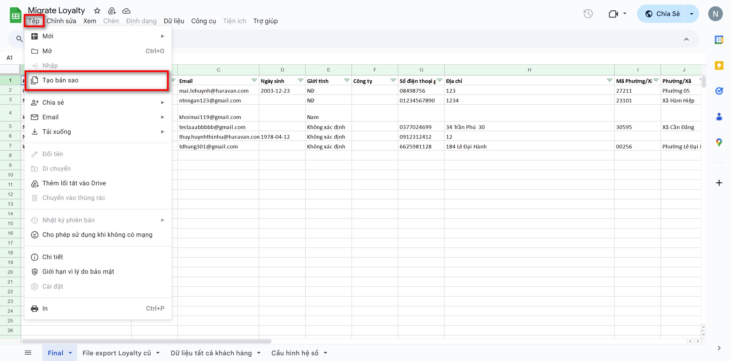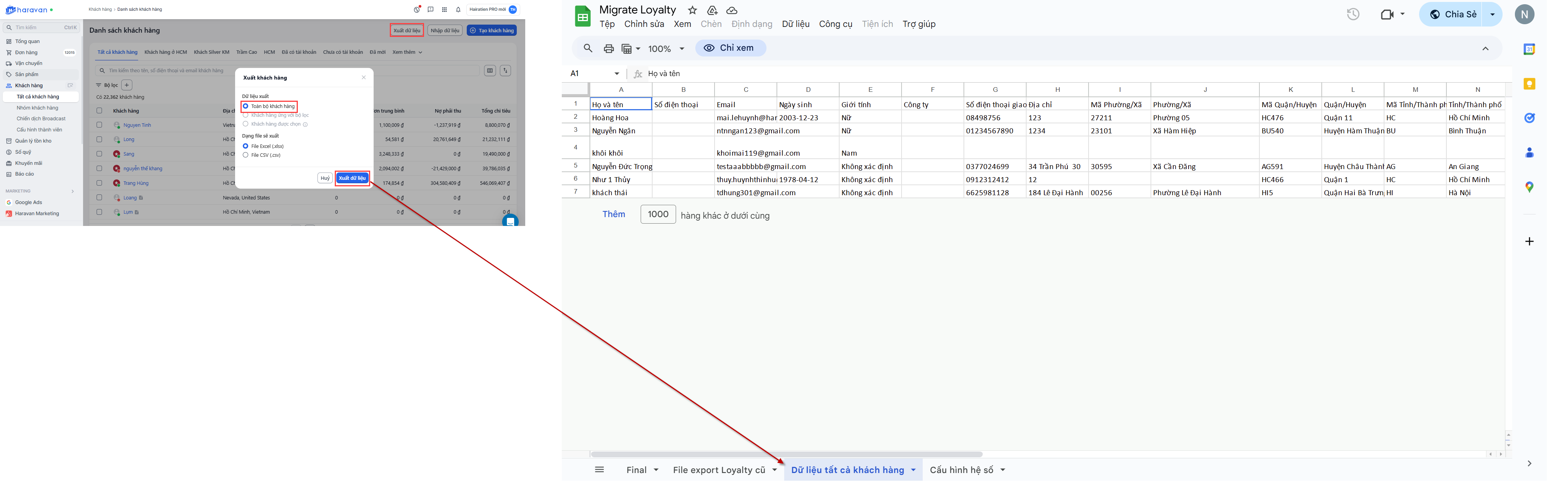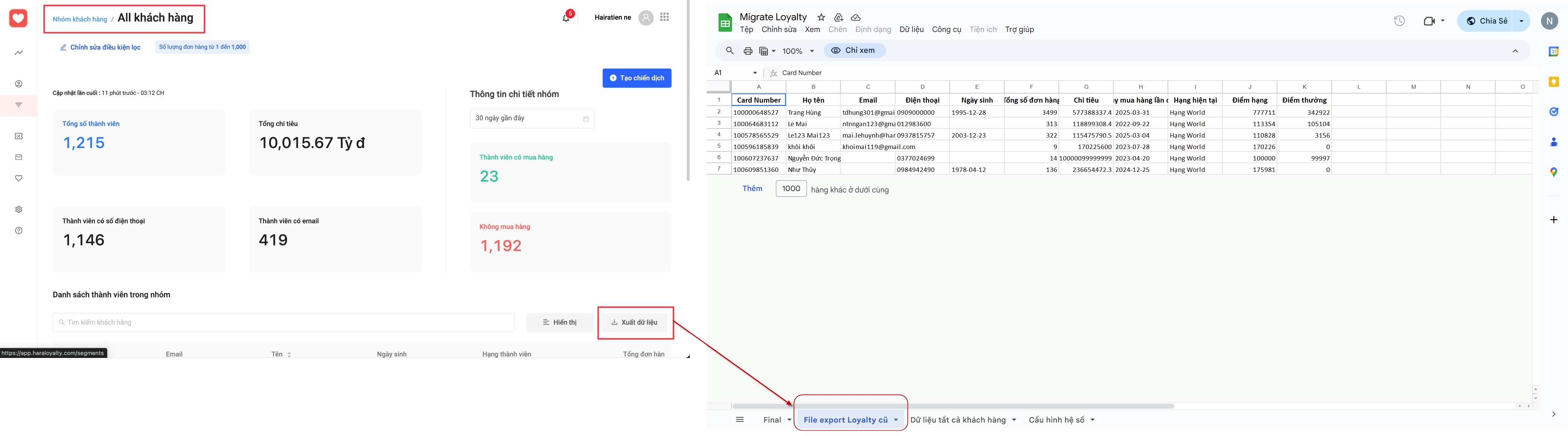 - File export Loyalty cũ: Nhập thông tin từ file nhóm khách hàng tải từ app Haraloyalty cũ vào sheet.