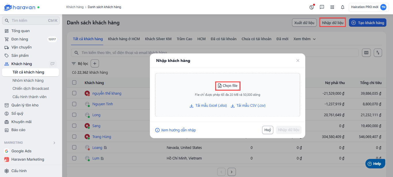- Bước 4 Tải file dữ liệu lên hệ thống Haravan để ghi nhận thông tin khách hàng, hạng thành viên, điểm thưởng