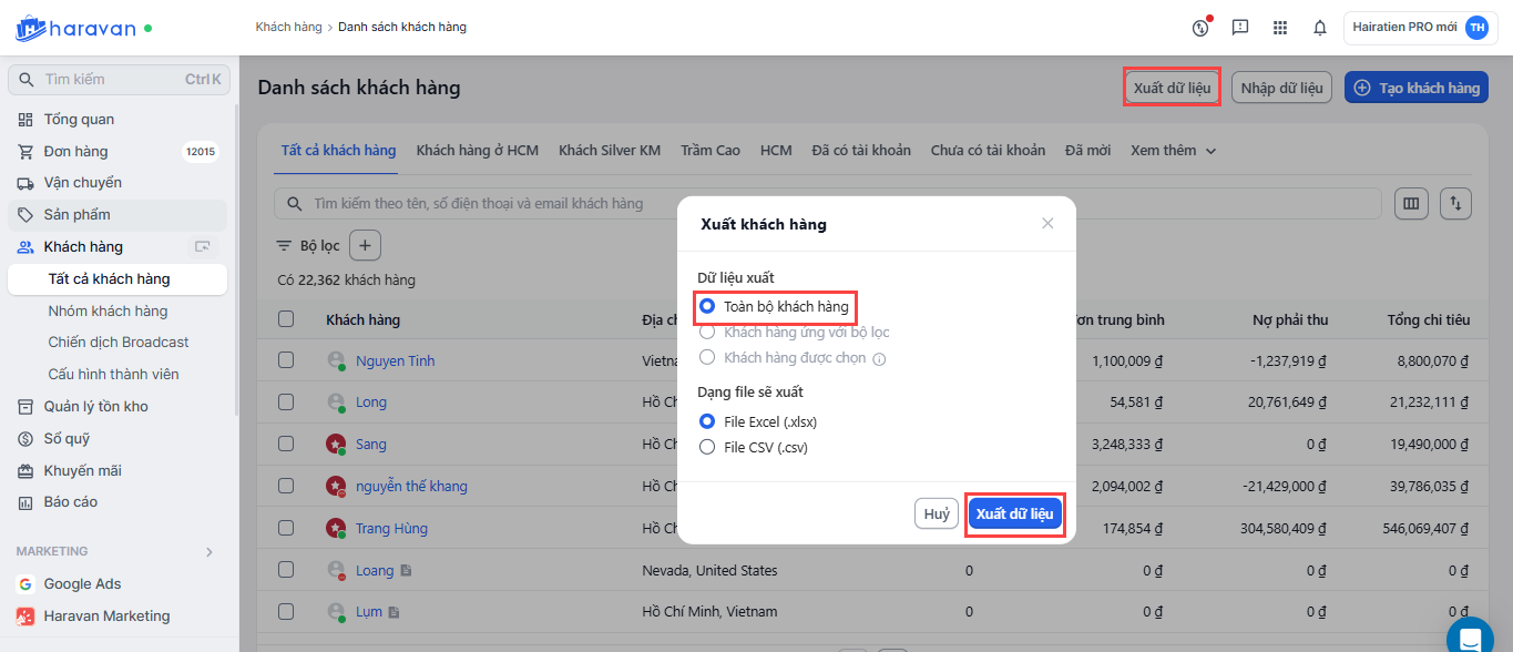 Hướng dẫn xuất danh sách tất cả khách hàng trên admin MyHaravan