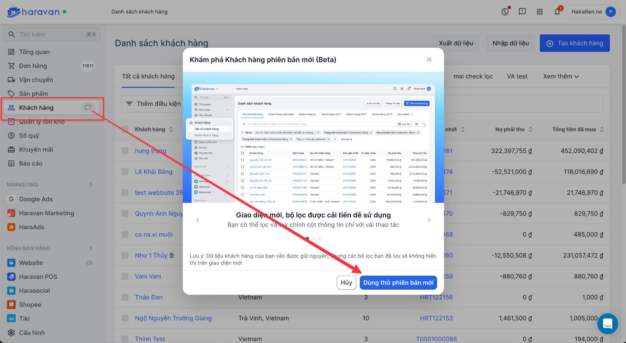2.1 Nhà bán vào trang quản trị MyHaravan, chọn Menu Khách hàng và bấm nút chuyển sang sử dụng chức năng khách hàng mới.