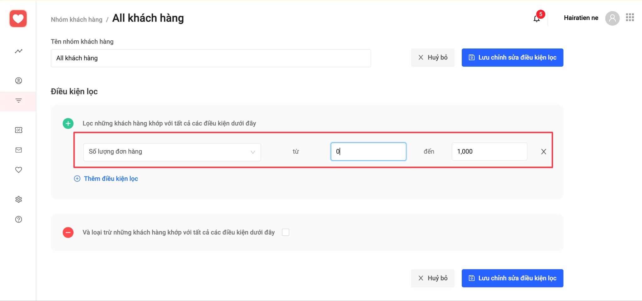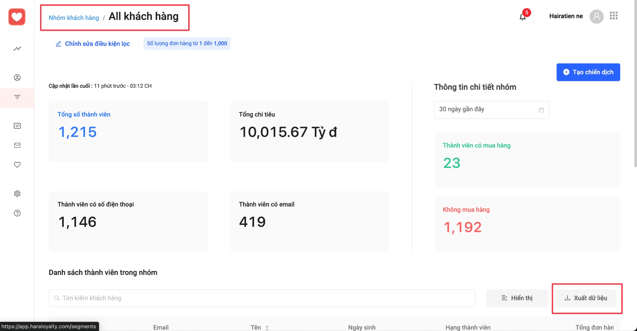1.1 Nhà bán vào App HaraLoyalty cũ tạo 1 nhóm khách hàng, hãy đảm bảo lấy đủ số lượng thành viên của shop. Ví dụ tạo nhóm khách hàng có số lượng đơn hàng từ 0 đến 1000 đơn.