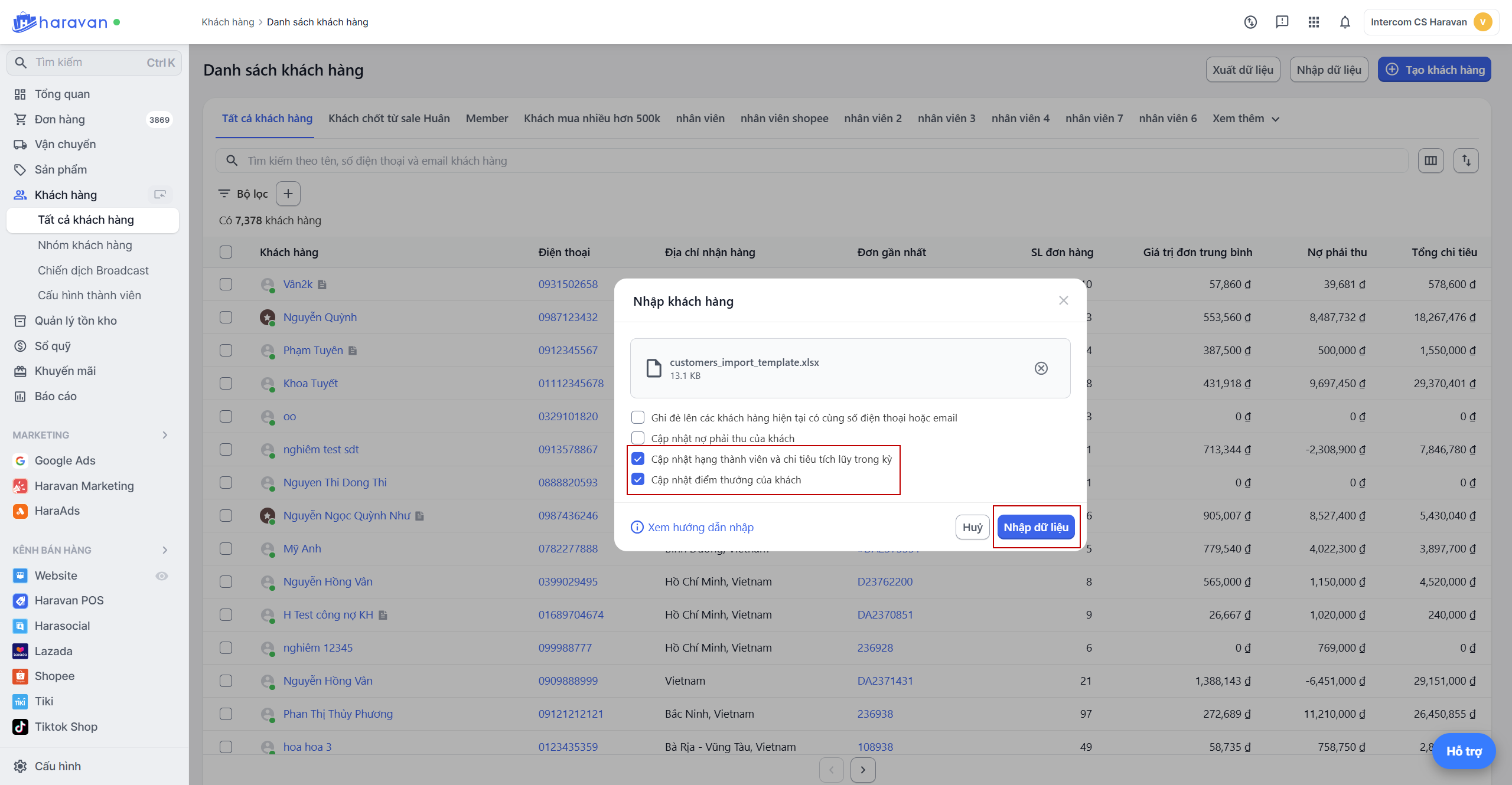 Bước 4 Tải file dữ liệu lên hệ thống Haravan để ghi nhận thông tin khách hàng, hạng thành viên, điểm thưởng
