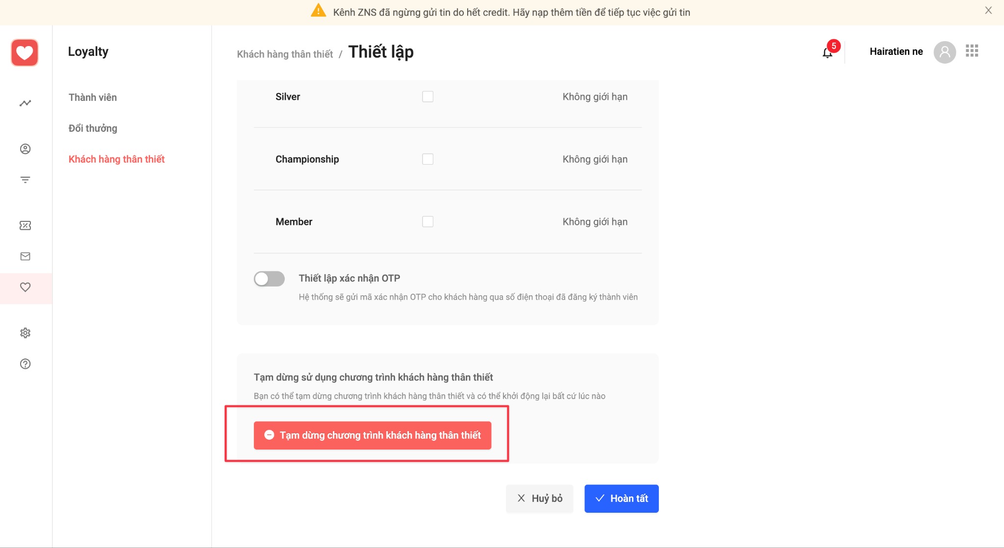 1.4 Tại màn hình Khách hàng thân thiết kéo xuống dưới cùng và chọn “Tạm dừng chương trình khách hàng thân thiết”