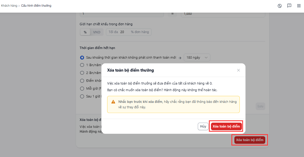 Để xóa toàn bộ hệ thống điểm thưởng, bạn cần tắt tính năng điểm thưởng trước, sau đó chọn Xóa toàn bộ điểm thưởng -> Chọn Xóa toàn bộ điểm thưởng để hoàn tất.