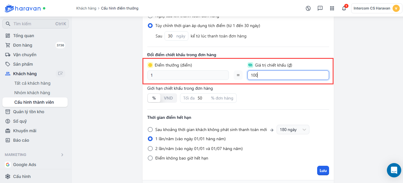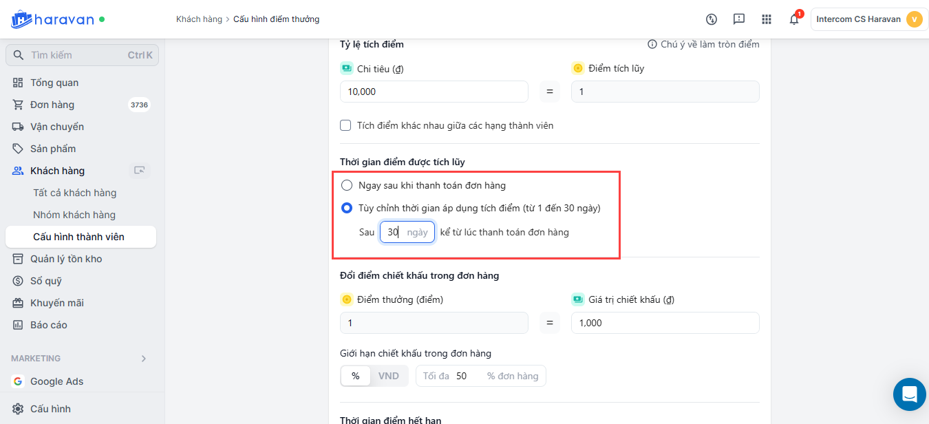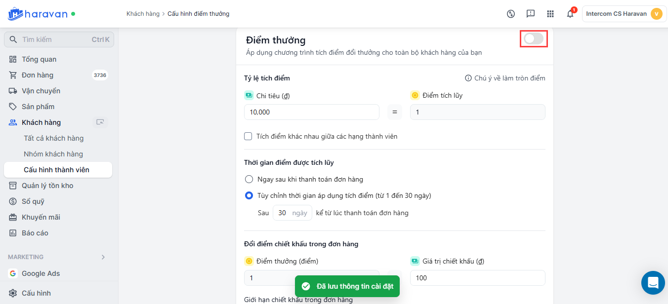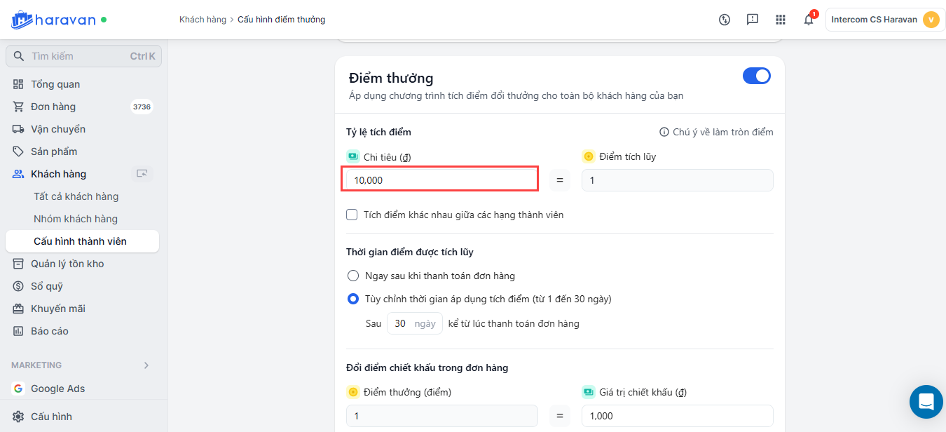 Thiết lập chương trình tích điểm đổi thưởng trong mục Khách hàng trang admin MyHaravan