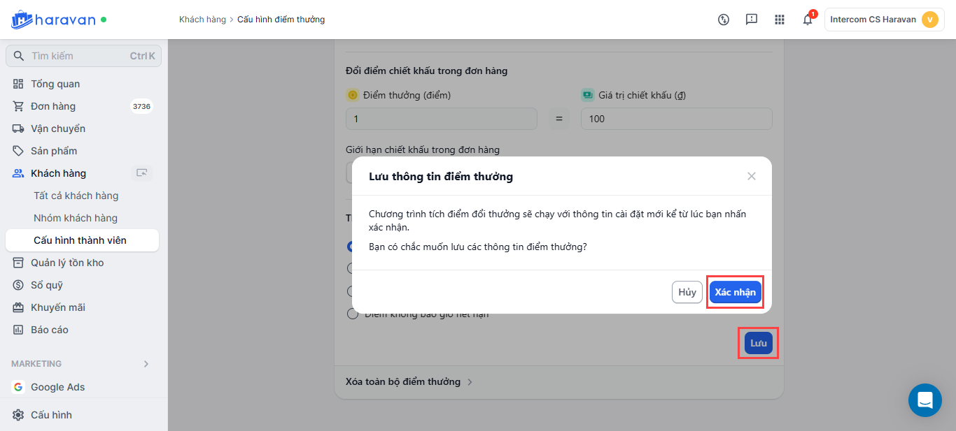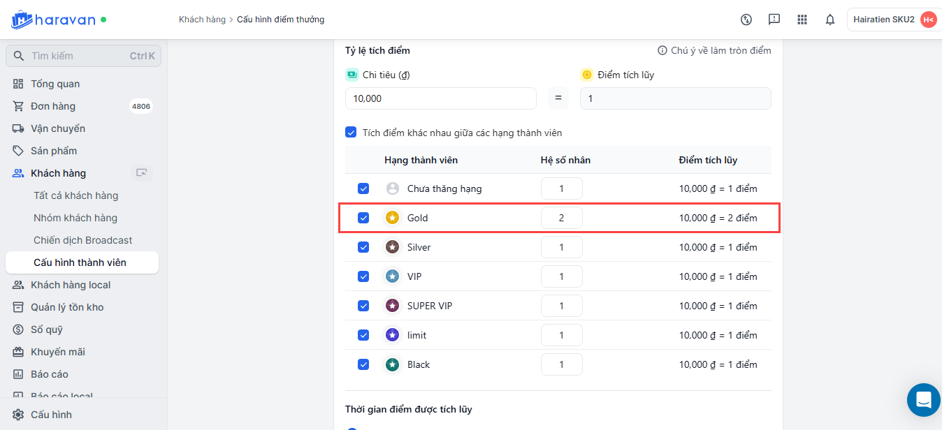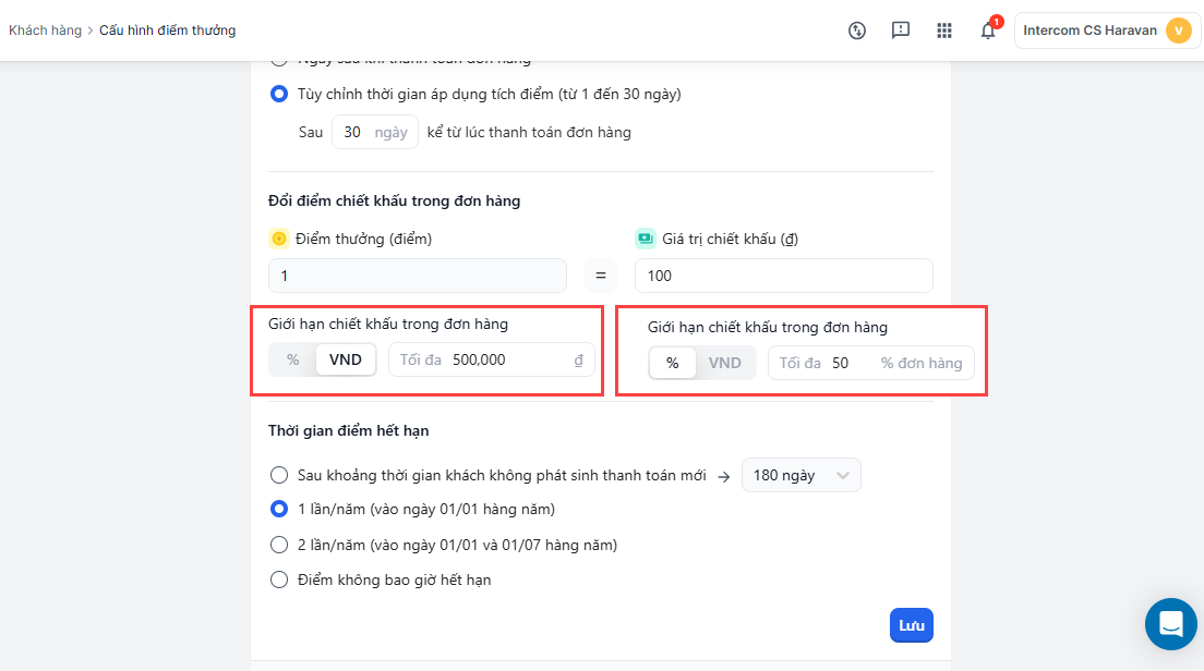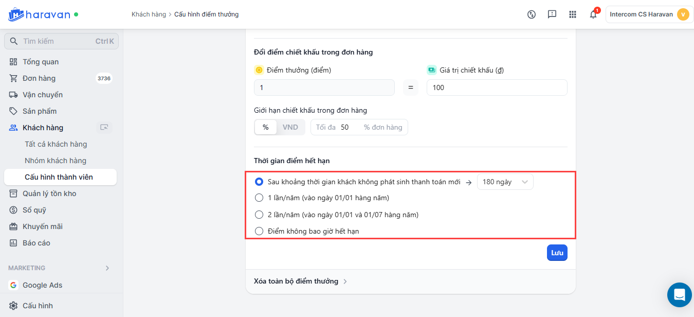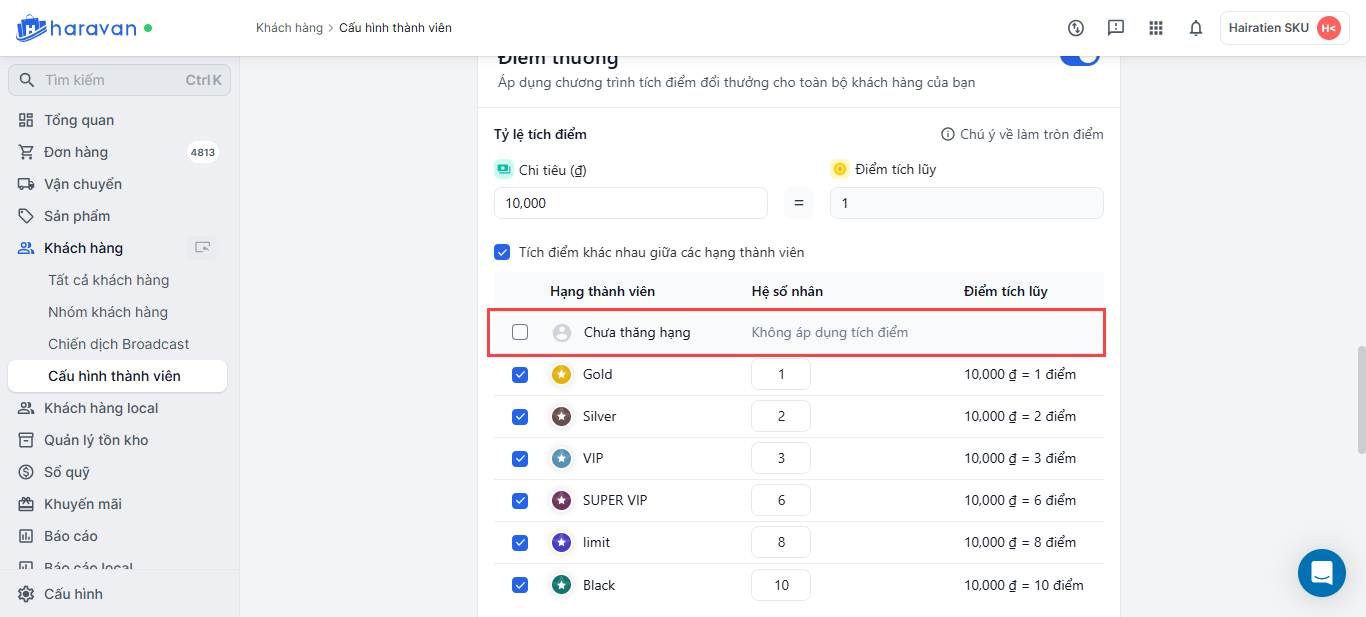 Thiết lập chương trình tích điểm đổi thưởng trong mục Khách hàng trang admin MyHaravan