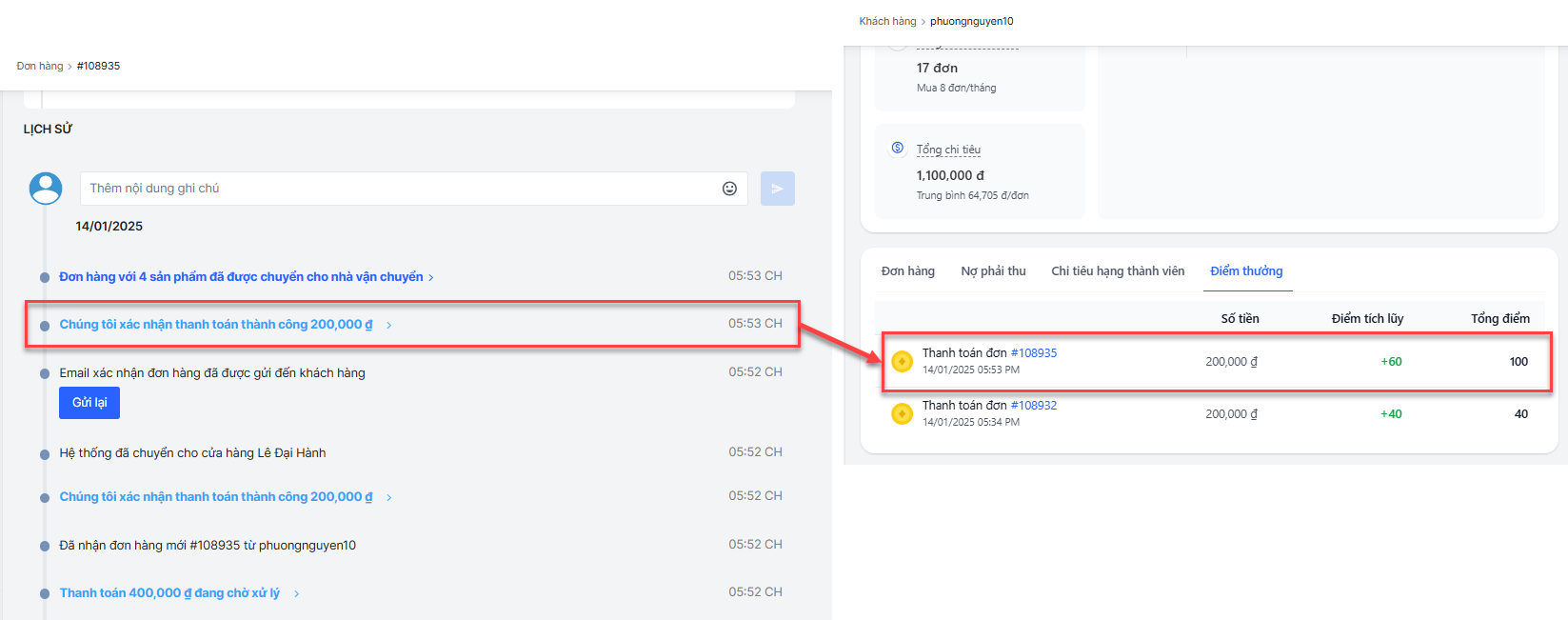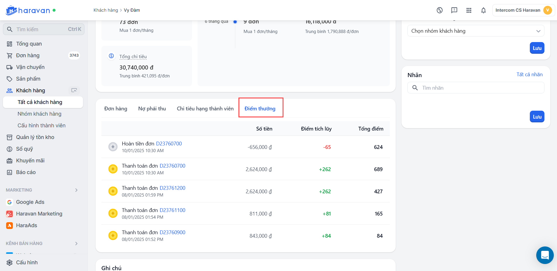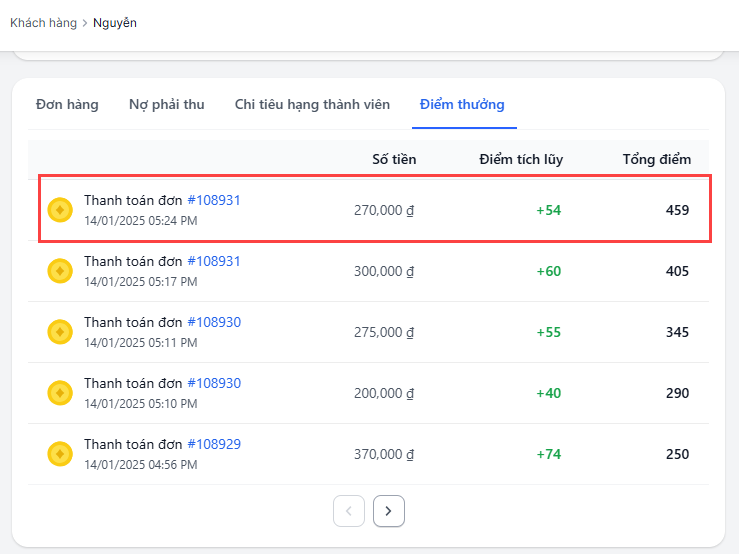 Điểm thưởng sẽ được ghi nhận chi tiết trong trang chi tiết khách hàng. Mục quản lý Điểm thưởng sẽ liệt kê các đơn hàng được tính điểm thưởng, đơn hoàn trả và số điểm hoàn theo đơn.