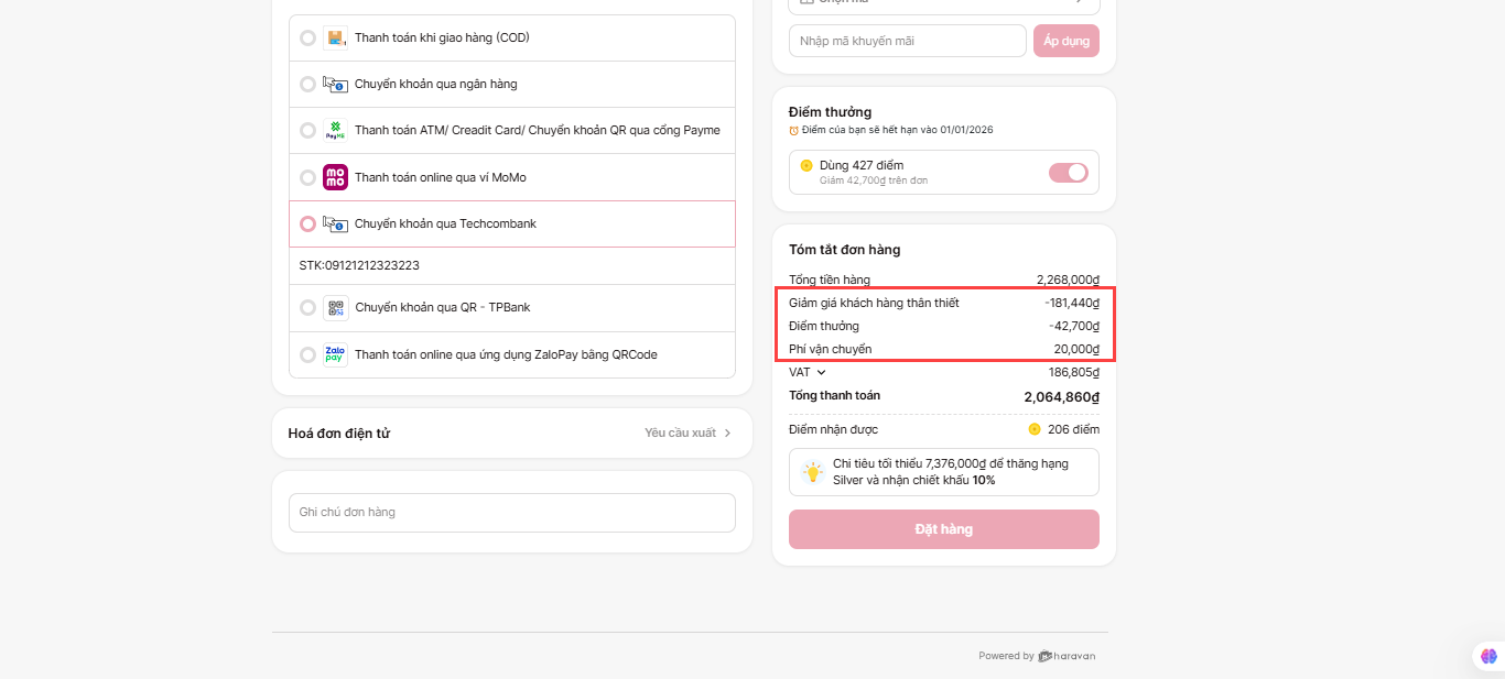 Chiết khấu điểm thưởng sẽ được áp dụng sau chiết khấu khách hàng thân thiết và trước khi cộng thêm phí vận chuyển.