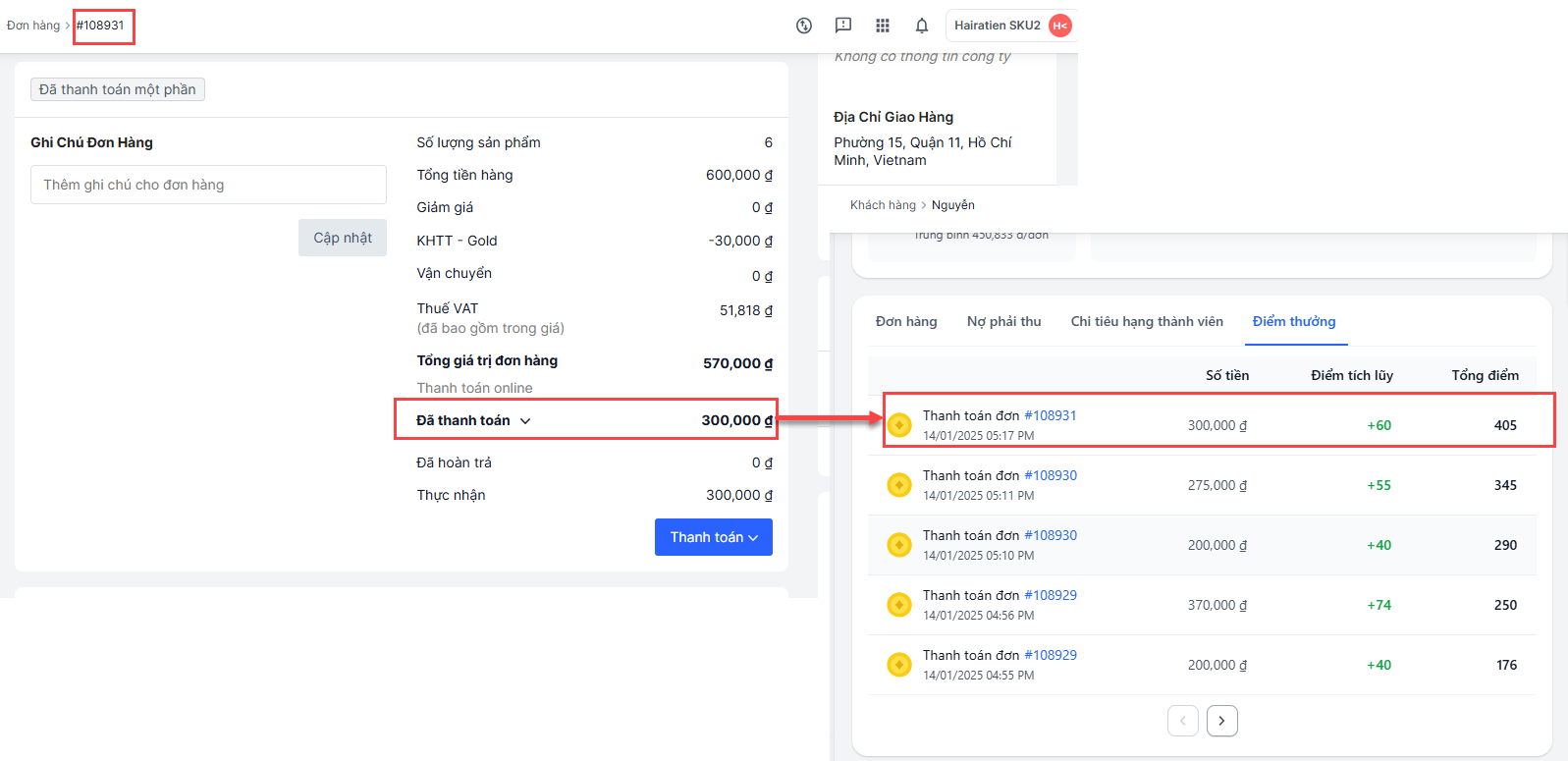 Ví dụ: Đơn chỉ ghi nhận điểm thưởng cho số tiền thanh toán sau, do trước đó tiểm điểm hạng thành viên của khách hàng đã tắt.