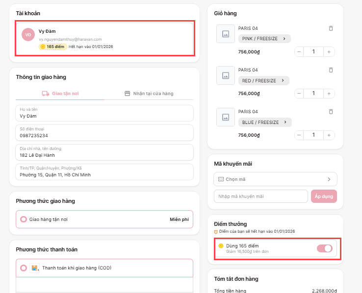 - Áp dụng điểm thưởng để giảm giá trực tiếp trên đơn hàng