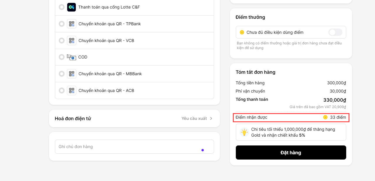 Khách hàng có hạng Gold mua 1 đơn hàng có tổng giá trị là 570.000đ và đã thanh toán trước 300.000đ. Điểm thưởng nhận được sẽ là 60đ (300.000đ x 2 / 10.000)