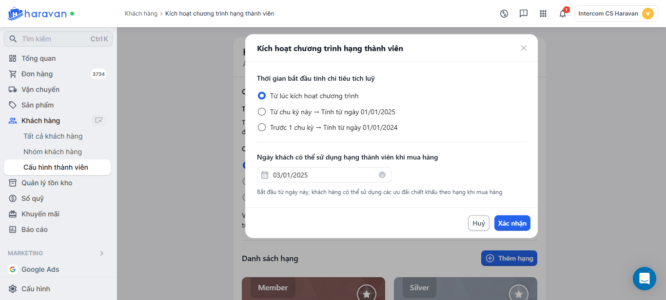 Sau khi cài đặt hạng thành viên và chu kỳ tích lũy, nhà bán kích hoạt để bắt đầu chạy chương trình khách hàng thân thiết. Khi bật chương trình, nhà bán hàng cần chọn thời gian kích hoạt chương trình.