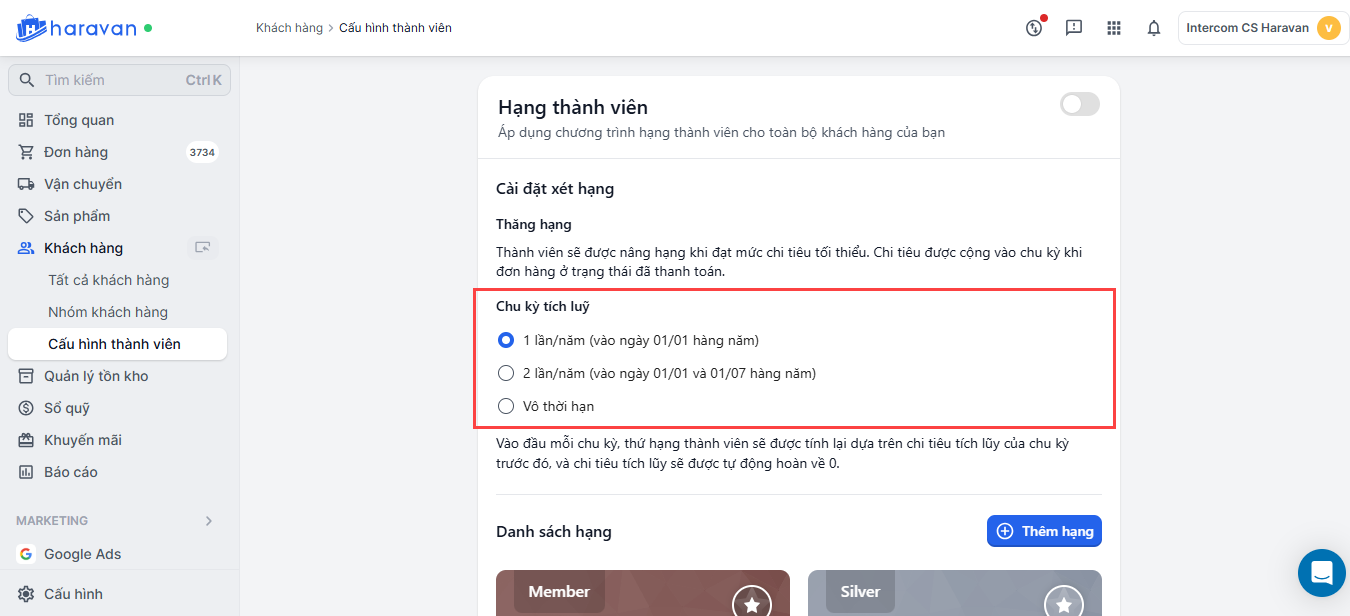 Chu kỳ tích lũy là thời điểm tính lại hạng thành viên của khách hàng. Có 3 tùy chọn về chu kỳ tích lũy mà nhà bán hàng có thể lựa chọn: