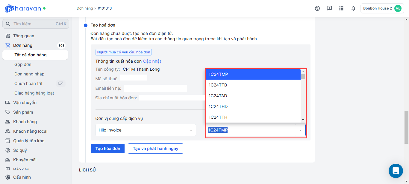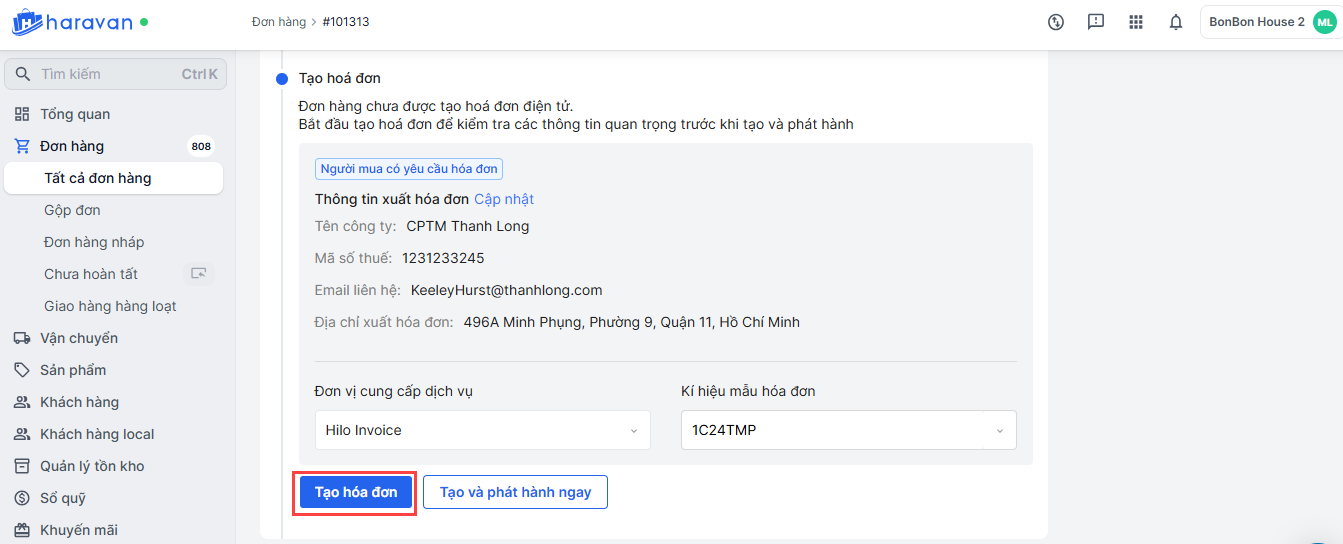 Tạo và phát hành hóa đơn trên quản trị MyHaravan