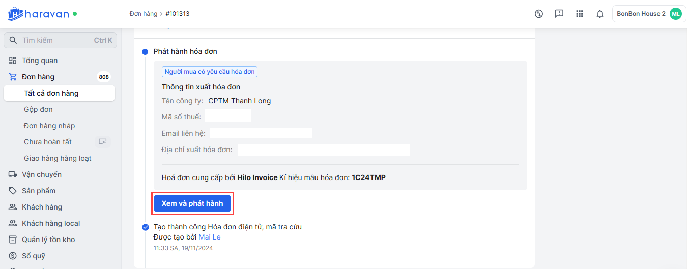 Trong trường hợp nhà bán hàn**g** không bật Tự động phát hành hóa đơn trên HaraRetail, nhà bán hàng cần thực hiện tạo và phát hành hóa đơn trên trang quản trị MyHaravan cho đơn hàng đã tạo trên POS.