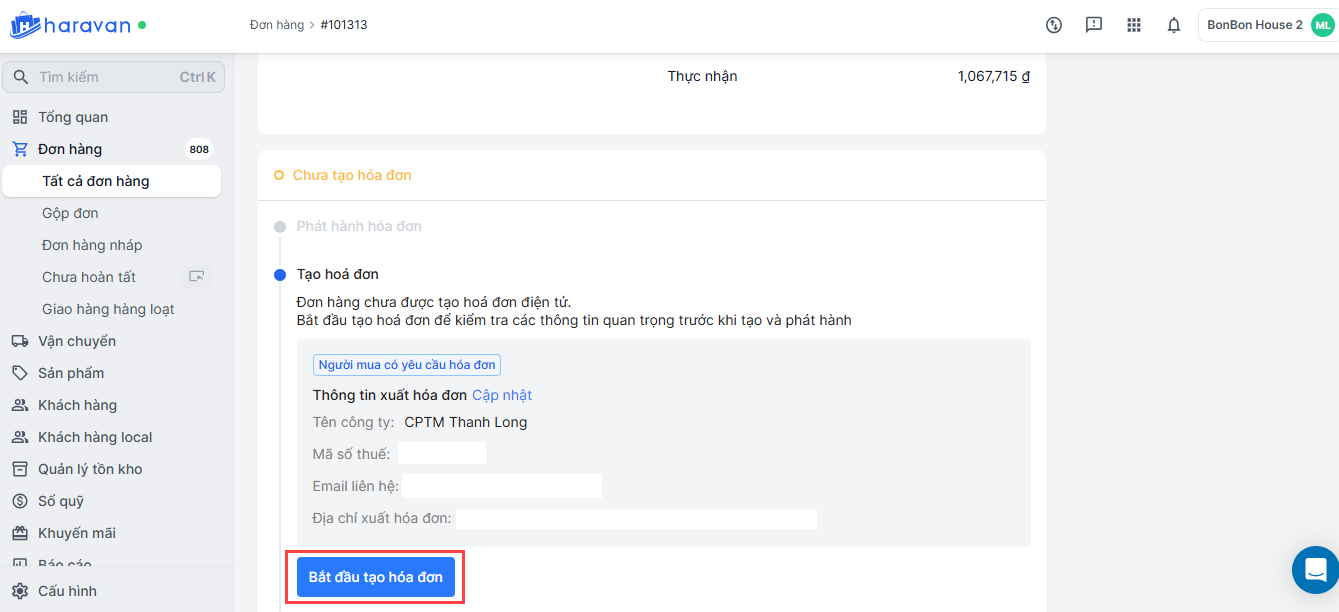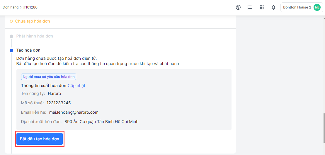 2. Tại trang chi tiết đơn hàng, nhà bán hàng chọn Bắt đầu tạo hóa đơn.