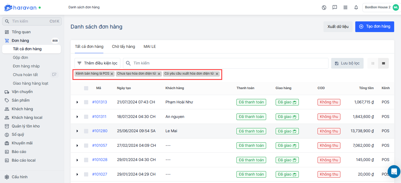 - Tại mục Đơn hàng, nhà bán hàng thực hiện lọc theo điều kiện