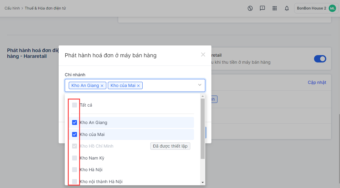 3. Chọn Chi nhánh để phát hành hóa đơn hoặc chọn Tất cả chi nhánh
