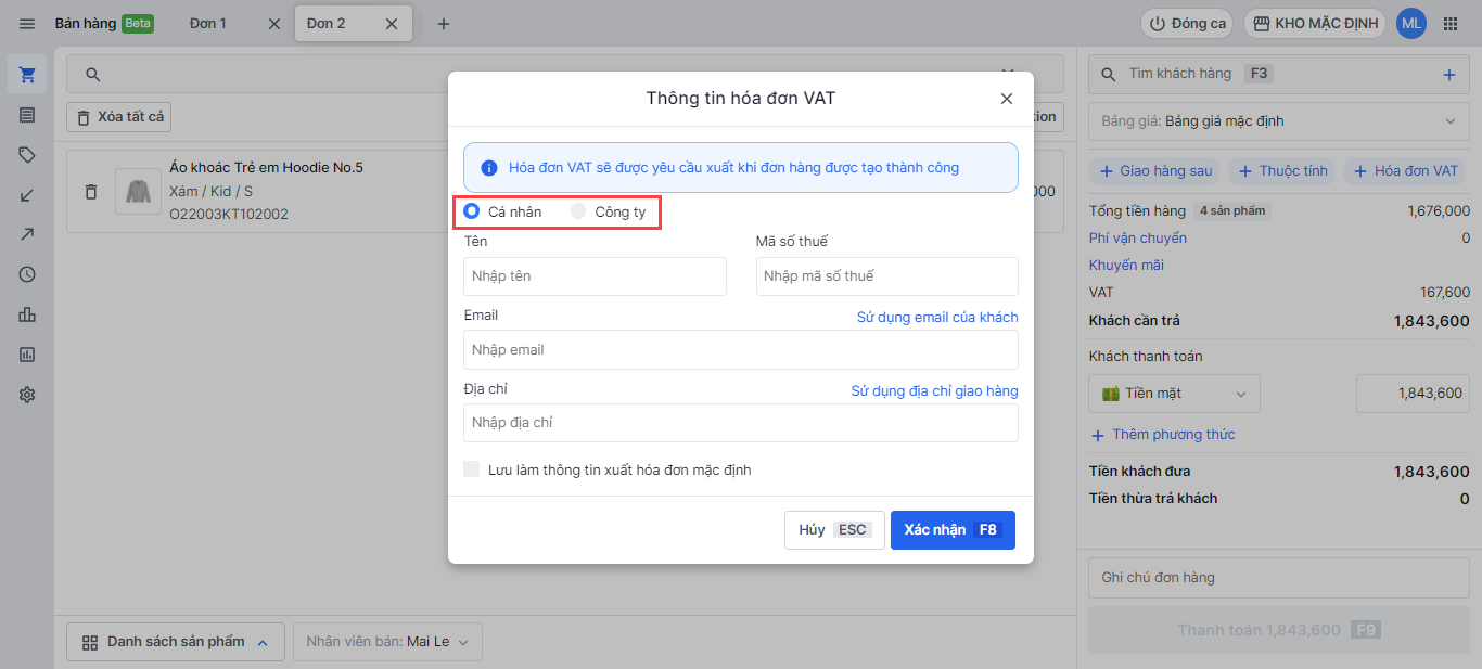 2. Chọn Cá nhân nếu người mua muốn xuất hóa đơn theo thông tin cá nhân hoặc chọn Doanh nghiệp khi người mua muốn xuất hóa đơn theo thông tin doanh nghiệp.