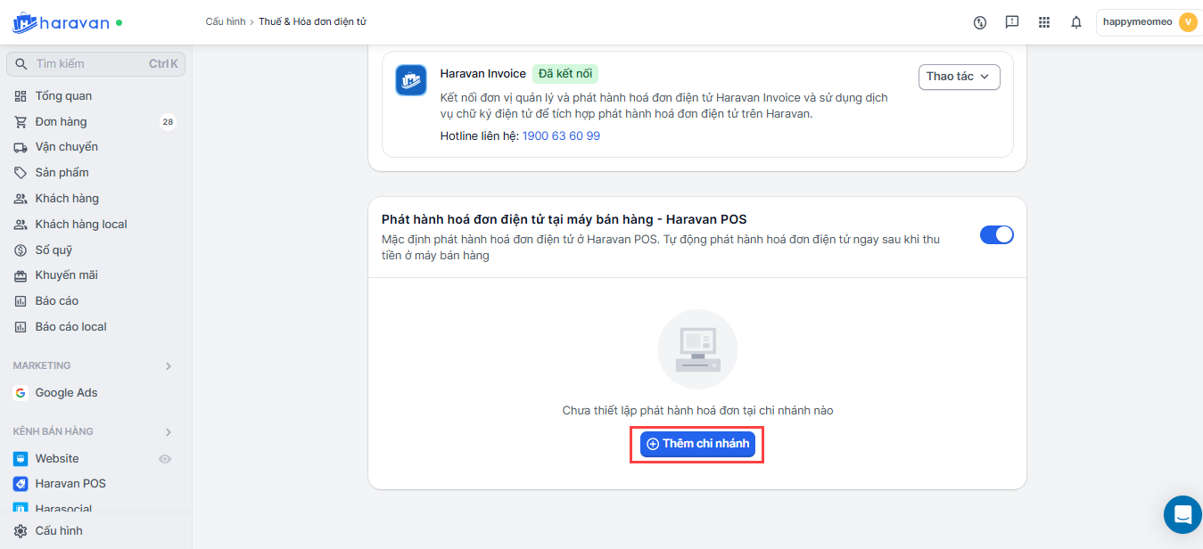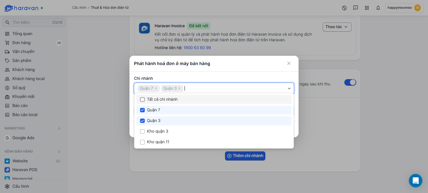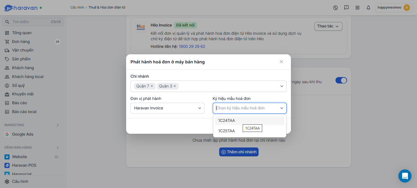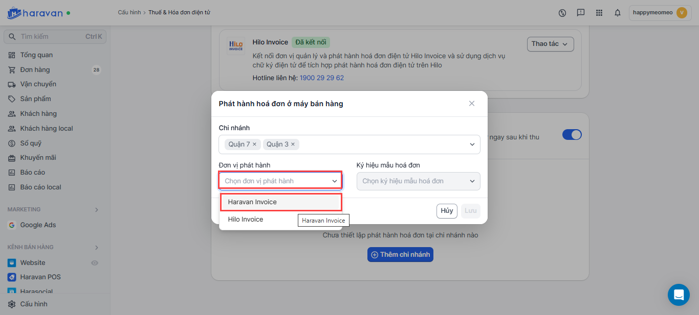 Thiết lập\phát hành hoá đơn điện tử Haravan Invoice tại máy bán hàng\
