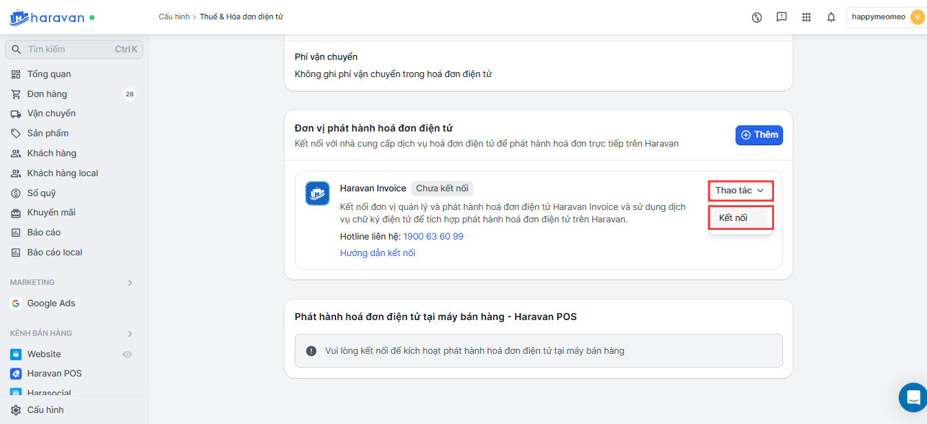 - Bạn chọn Thao tác và chọn Kết nối cạnh đơn vị phát hành Haravan Invoice