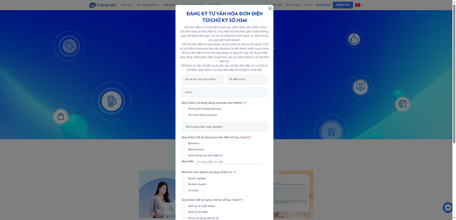 Bước 1: Để được hỗ trợ đăng ký tài khoản Haravan Invoice, Nhà bán hàng truy cập vào đường dẫn https://www.haravan.com/pages/giai-phap-xuat-hoa-don-dien-tu, chọn Tư vấn miễn phí và thực hiện nhập thông tin vào form đăng kí.