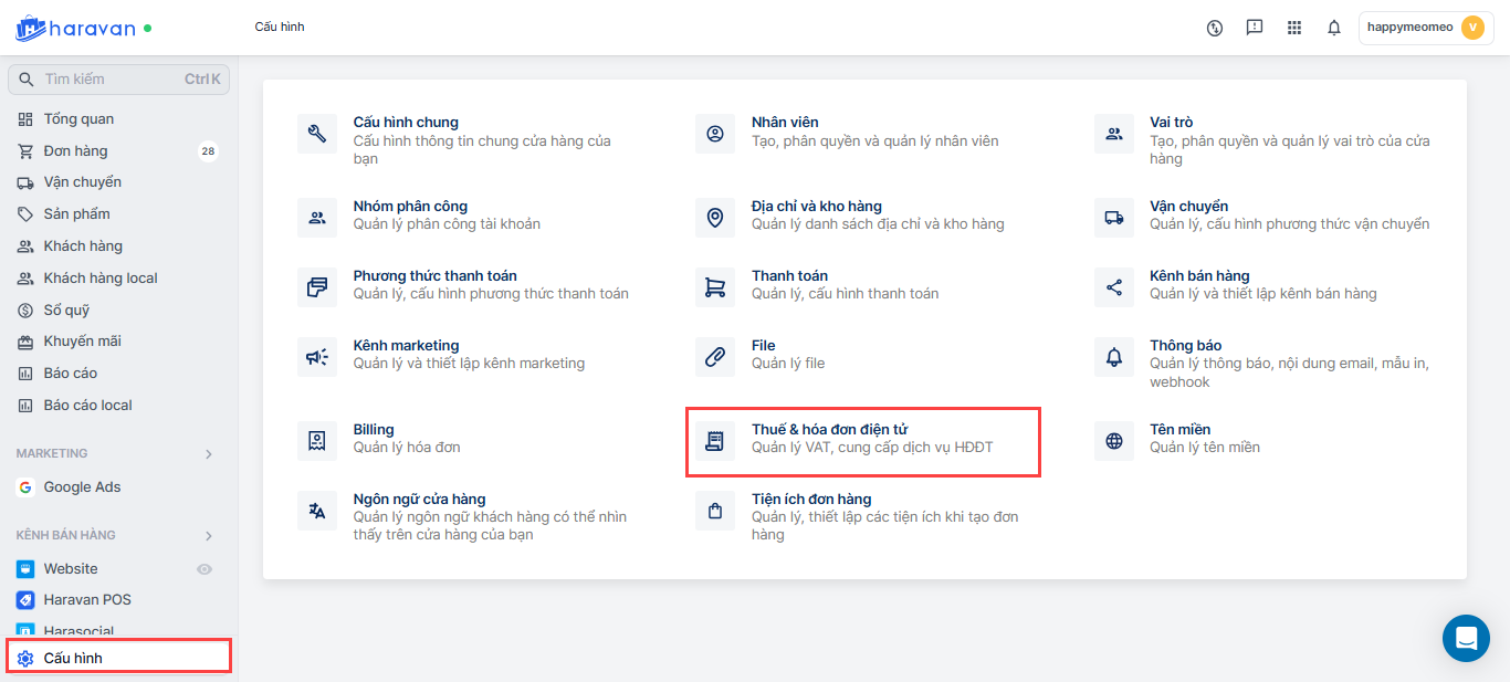 - Tại mục Cấu hình, bạn chọn Thuế và hóa đơn điện tử