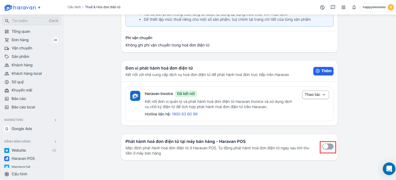 Để xuất hóa đơn điện tử tự động từ máy tính tiền, bạn cần bật cấu hình Phát hành hóa đơn điện tử tại máy bán hàng Haravan POS.