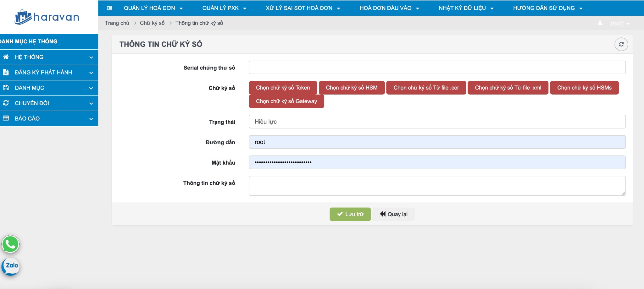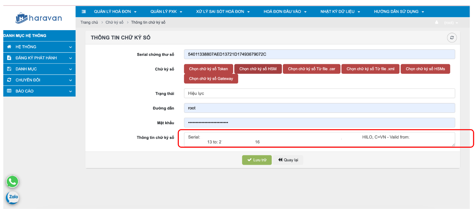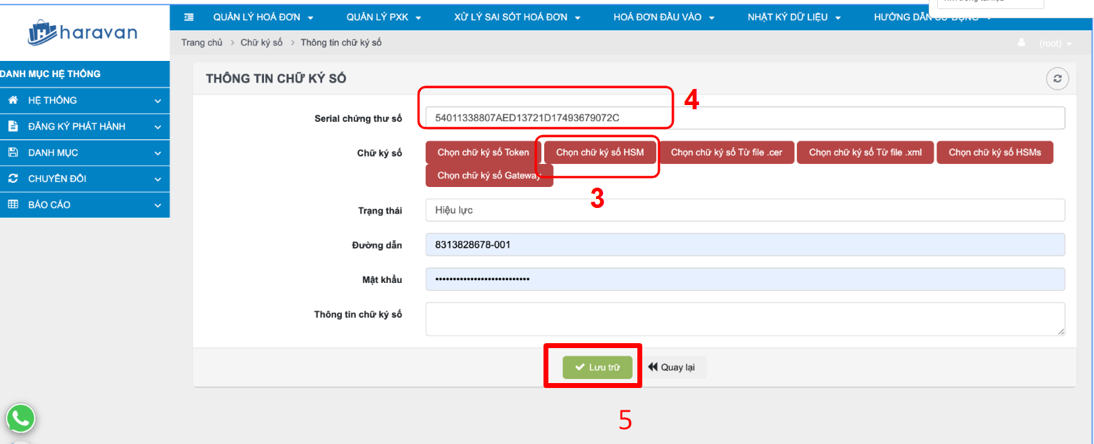 Cách 1: Chọn “chữ ký số HSM” => nhập số seri, sau đó hệ thống sẽ tự xuất hiện thông tin chữ ký số => click vào nút lưu trữ