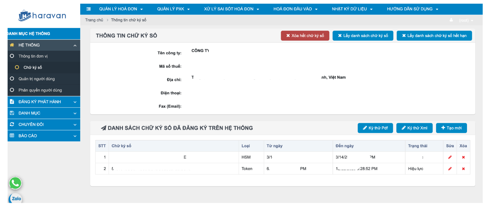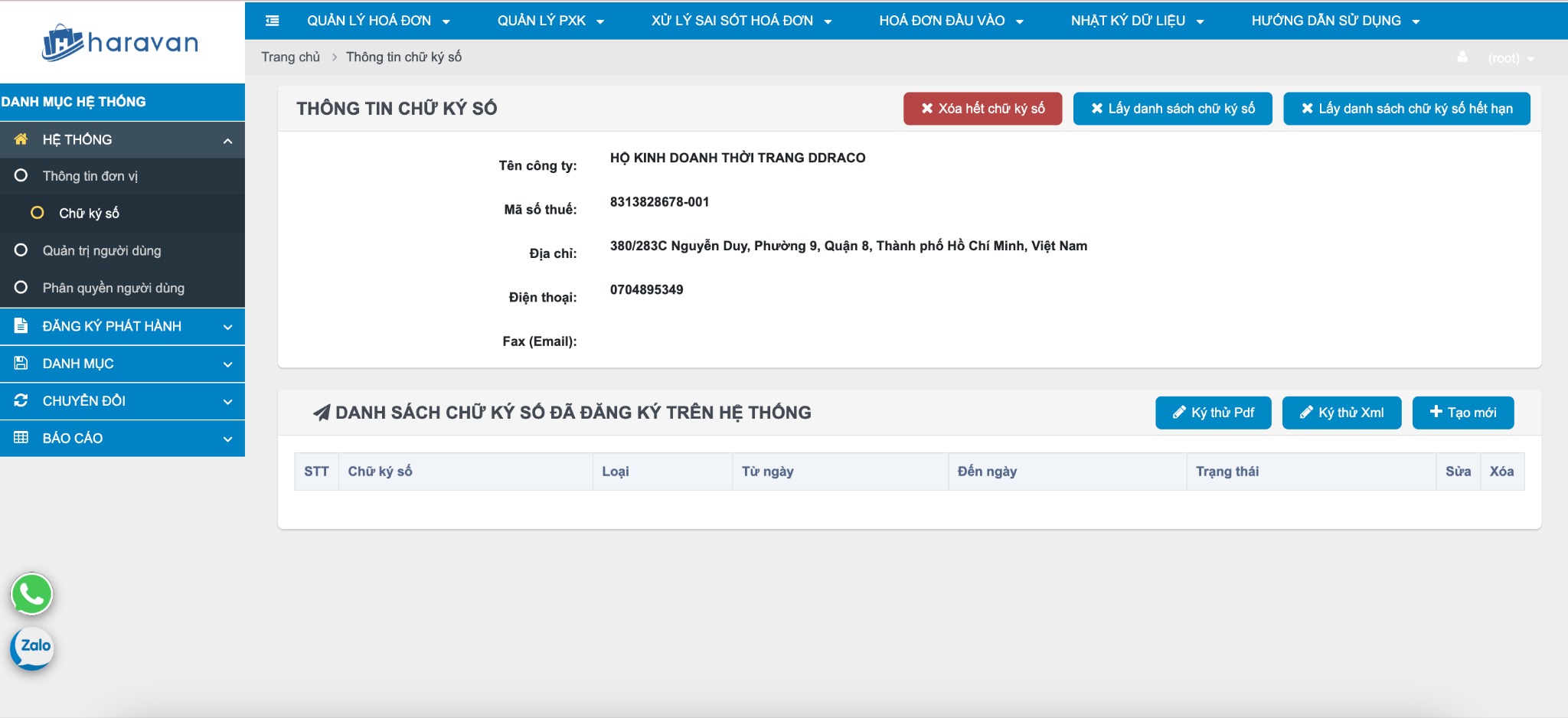 Bước 1 - Truy cập Haravan Invoice và chọn mục hệ thống => chữ ký số như hình => click "tạo mới"