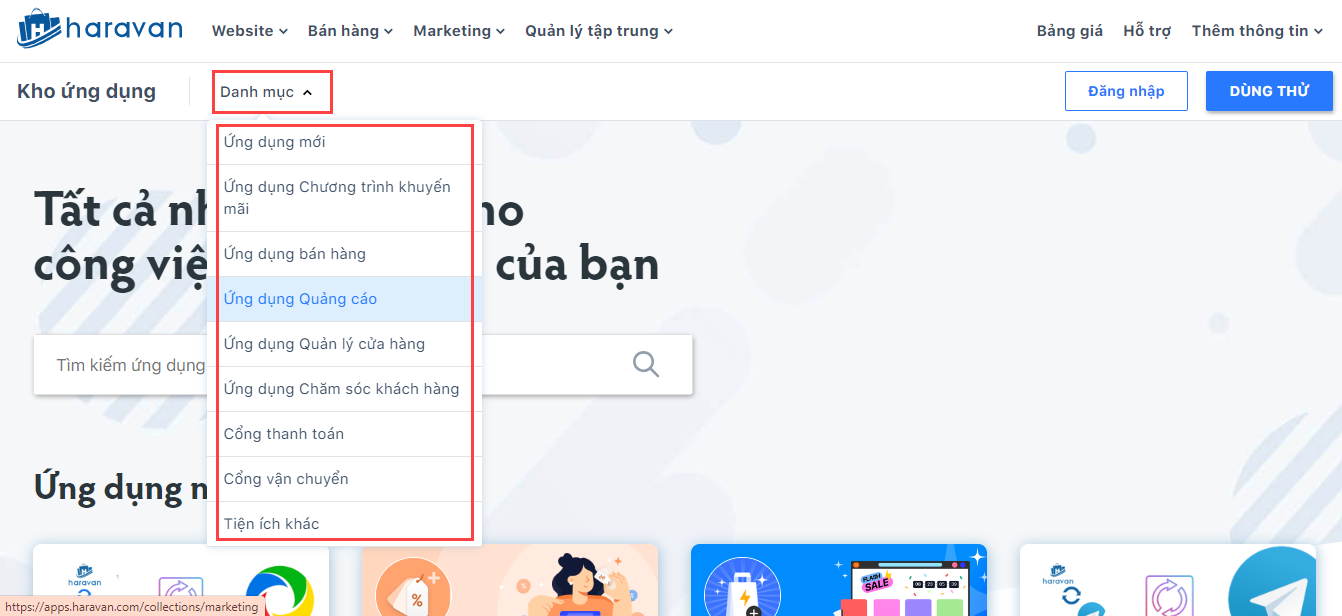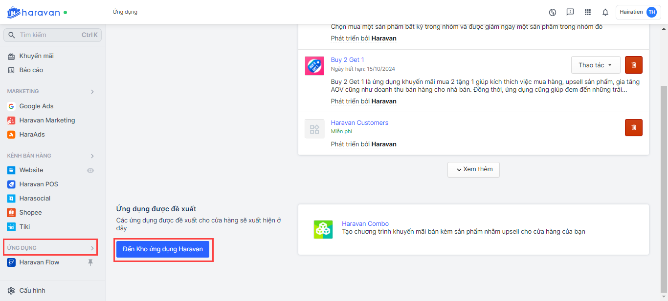 Bước 1: Truy cập vào trang quản trị MyHaravan → Chọn mục Ứng dụng.