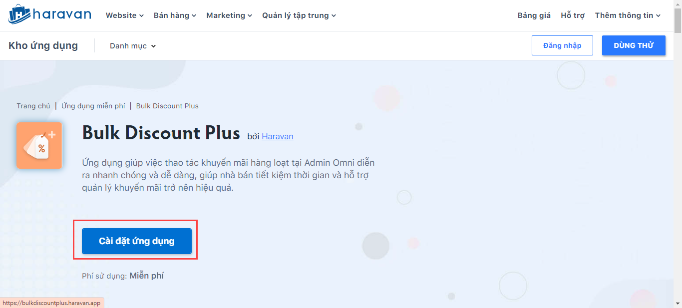 Bước 4: Ví dụ cài đặt ứng dụng Bulk Discount Plus, tại mục chi tiết ứng dụng, chọn Cài đặt ứng dụng