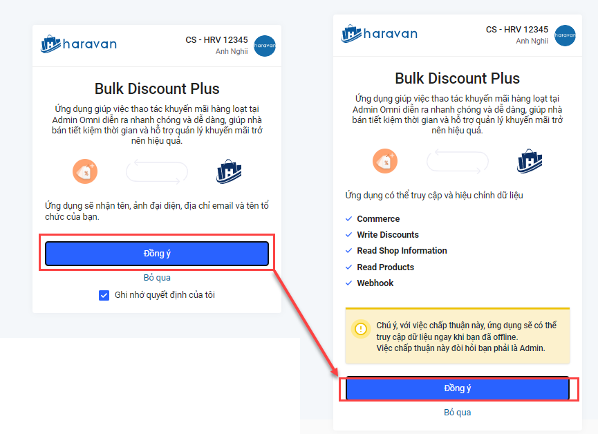 **Bước 5:** Hệ thống sẽ yêu cầu quyền kết nối ứng dụng Bulk Discount Plus, Nhà bán hàng chọn Đồng ý