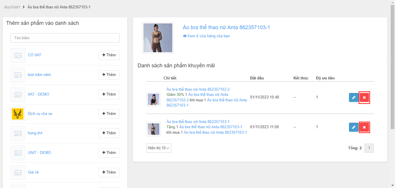 - Chọn dấu X bên cạnh khuyến mãi muốn xóa