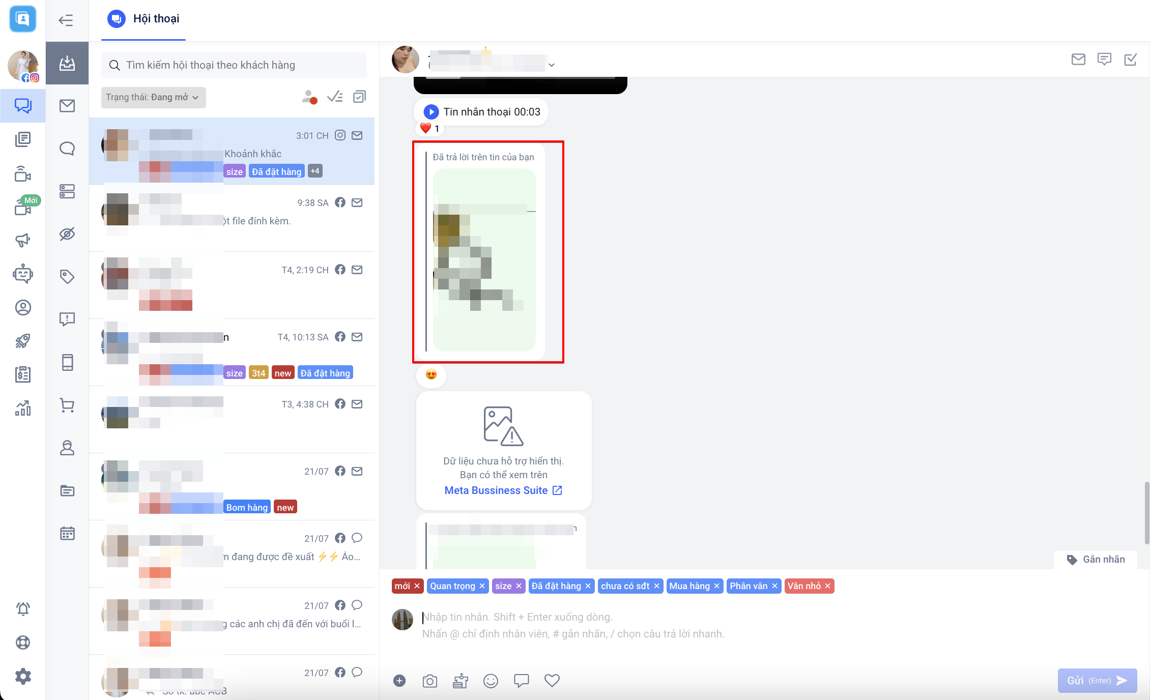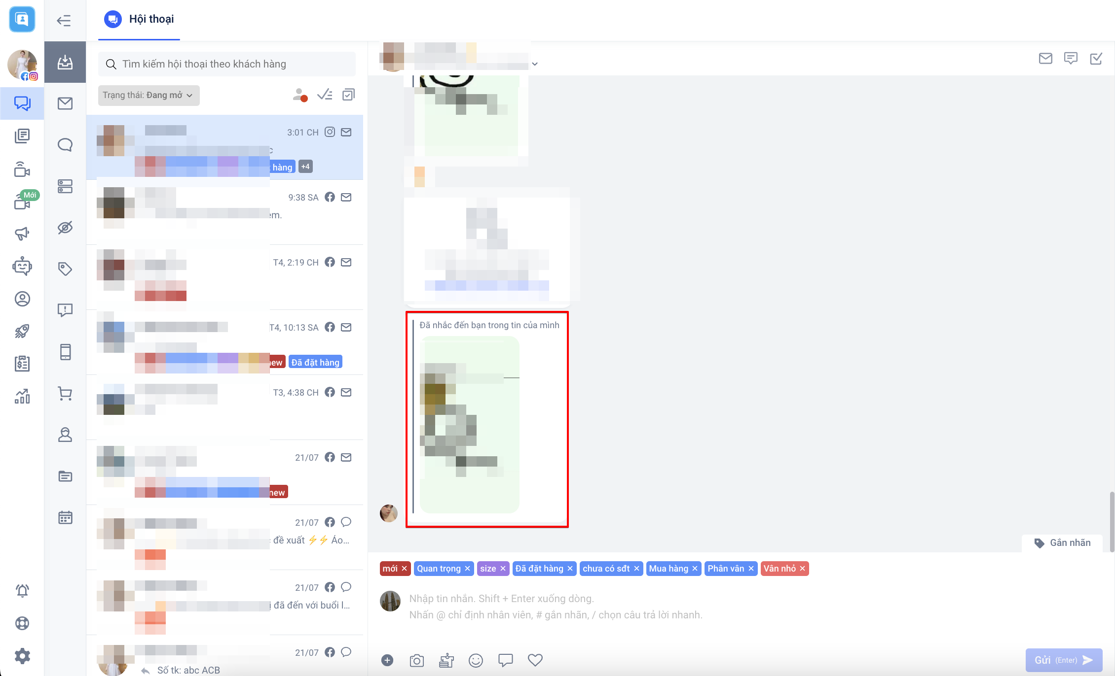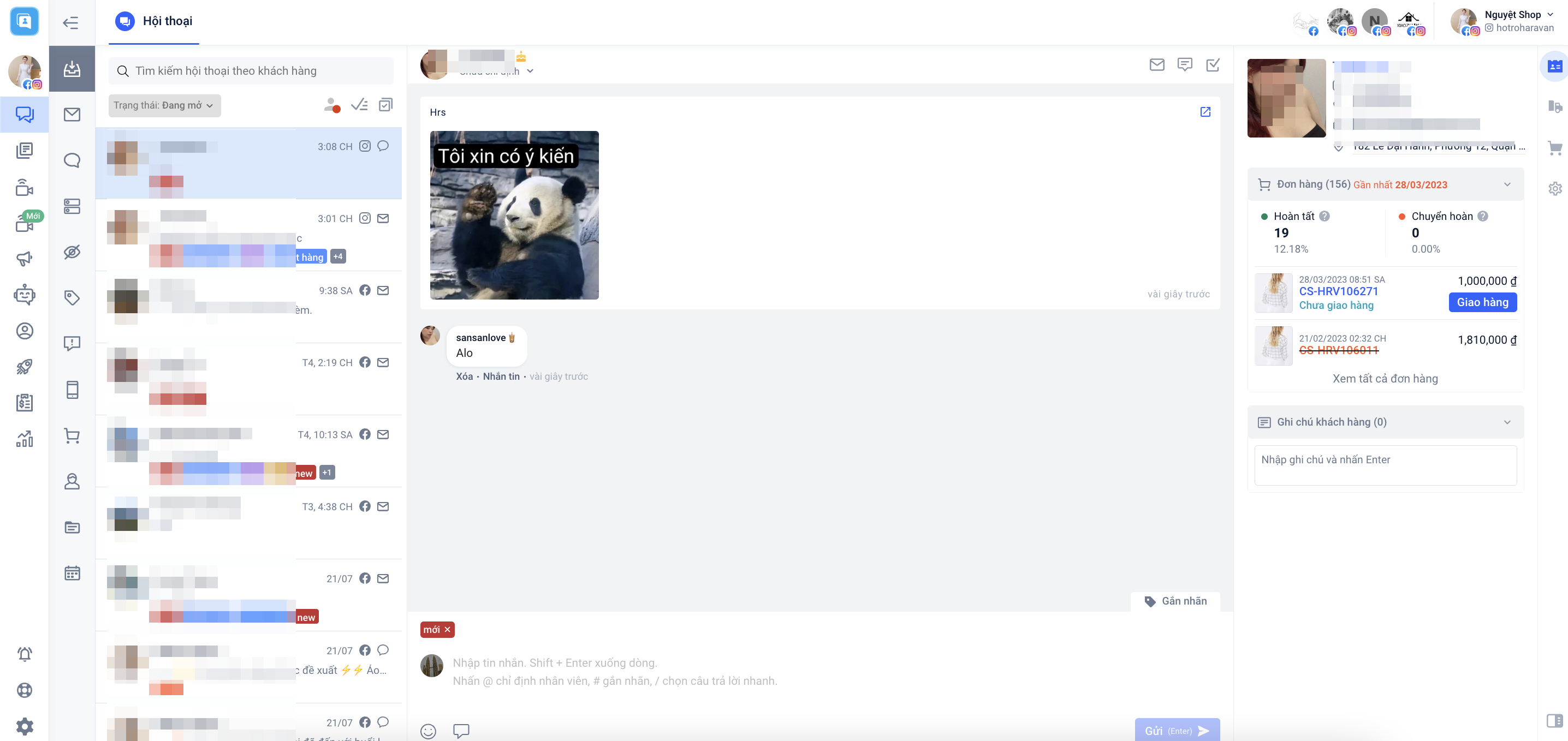 Khi khách hàng bình luận vào 1 bài viết của shop trên Instagram, hệ thống Harasocial sẽ đồng bộ hiển thị nội dung bình luận + thông tin khách hàng.