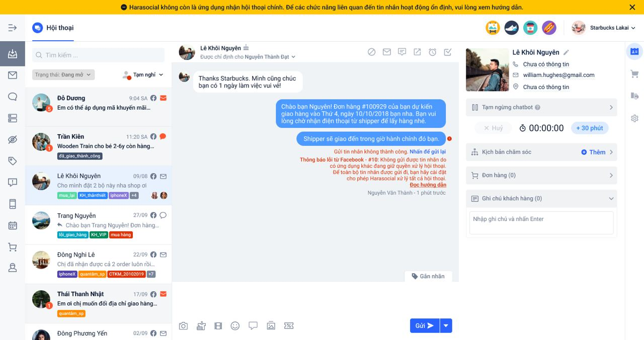 - Không thể gửi tin nhắn inbox trực tiếp***đến cho khách hàng và hiển thị****cảnh báo lỗi #10**như sau***"Thông báo lỗi từ Facebook - #10: Không gửi được tin nhắn do có ứng dụng khác đang giữ quyền xử lý hội thoại. Để toàn bộ tin nhắn được gửi đi, bạn hãy cài đặt cho phép Harasocial xử lý tất cả hội thoại"**.
